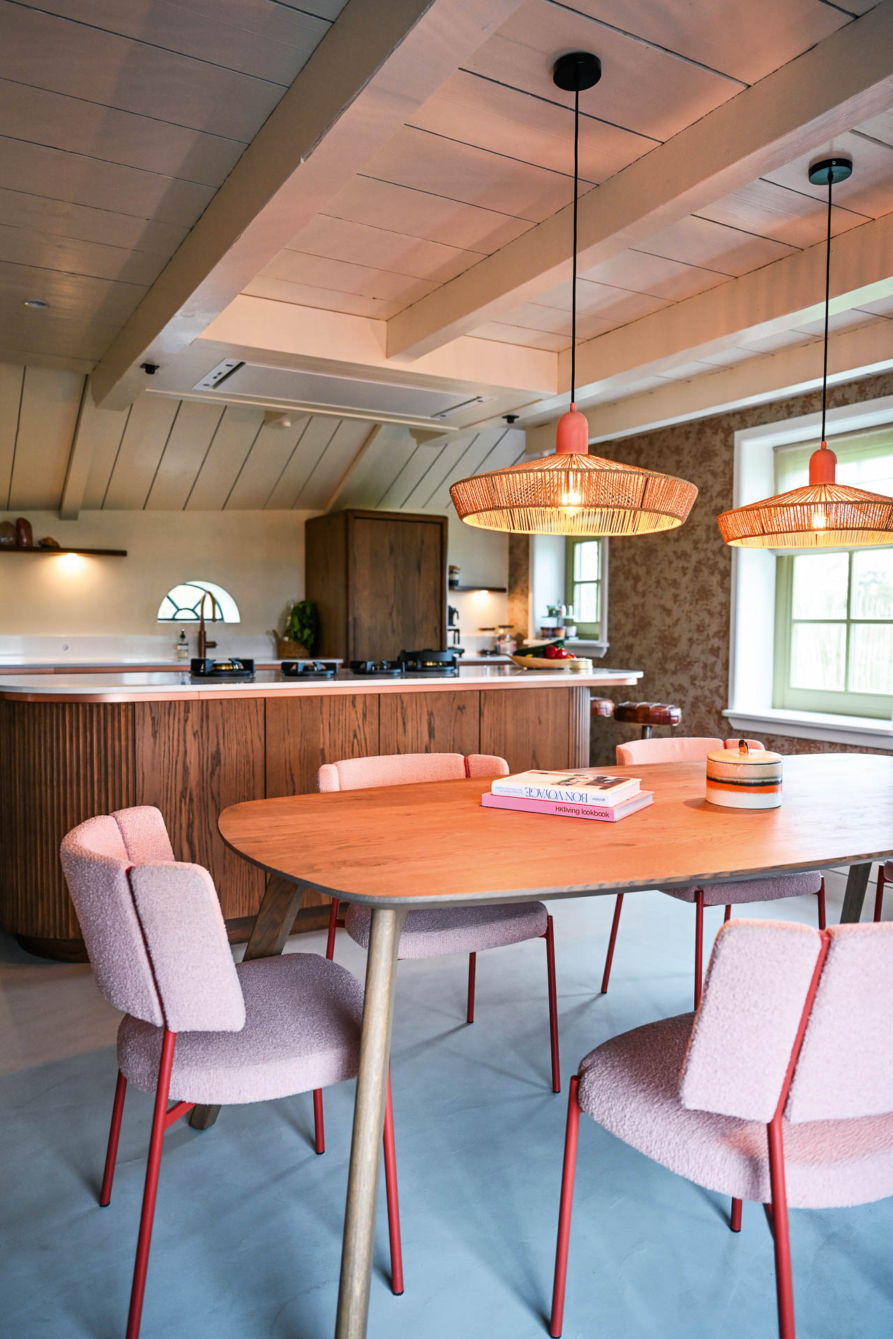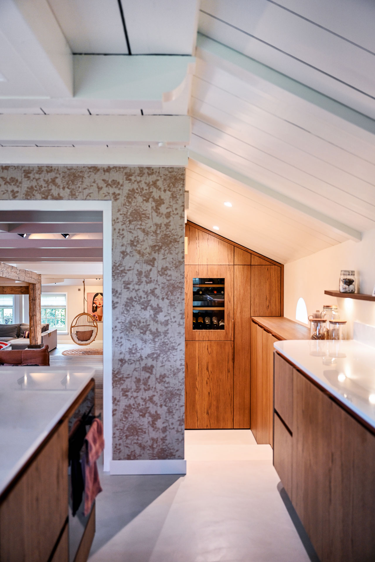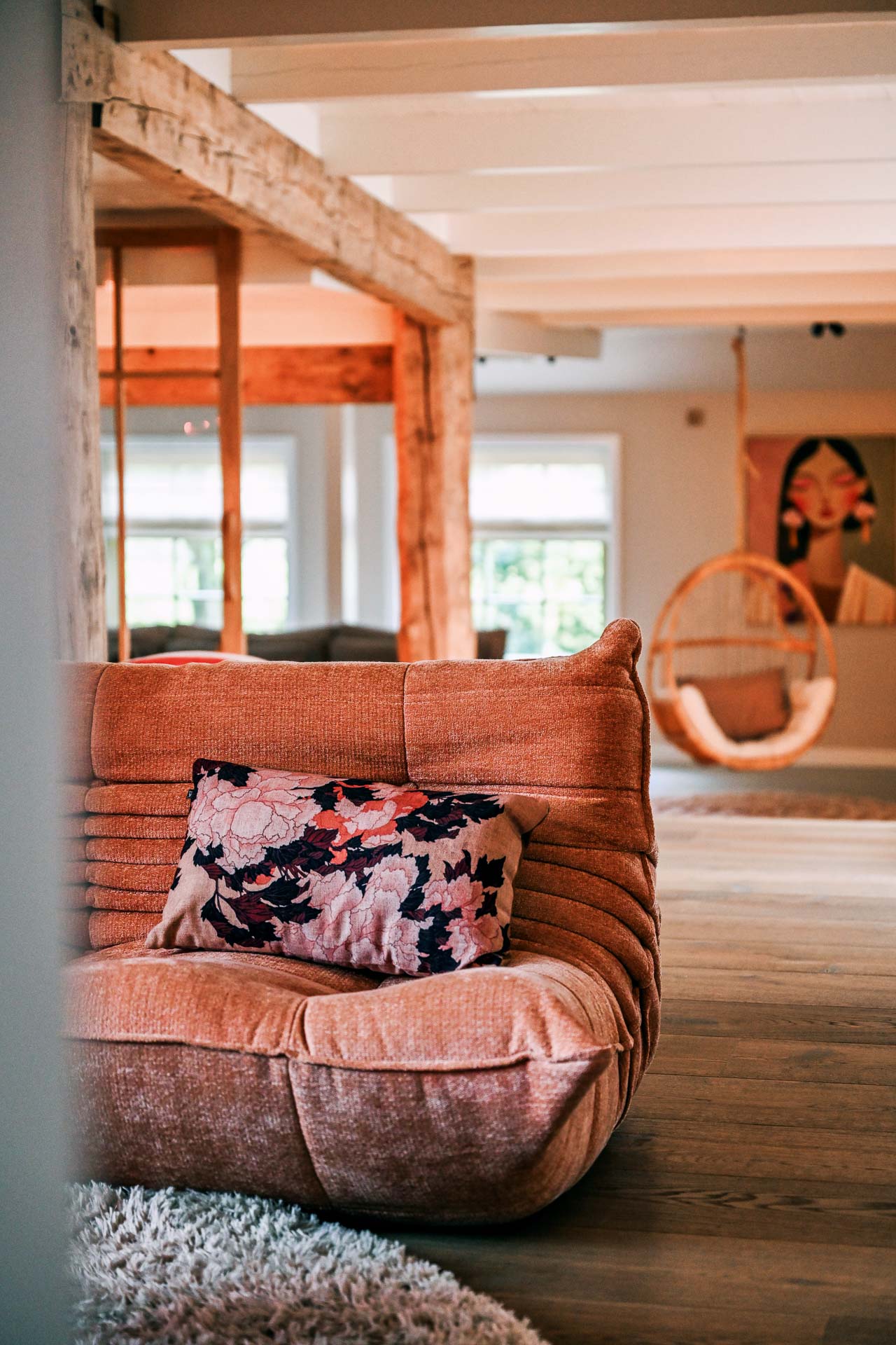 De inrichting is warm en doordacht. Geen standaard landelijke keuken, maar een op maat gemaakte houten droomkeuken met robuuste pitten, geïntegreerd in het werkblad. “Ik wilde geen gladde kookplaat, maar stoere, ambachtelijke pitten. We koken op gas. Het koper van de kranen komt subtiel terug in andere details, en de houten koelkast met afgeronde vormen is dé eyecatcher van de keuken.” Maatwerk voert de boventoon in het interieur: van badkamerkasten tot bijkeuken en eettafel. “Het meeste is door onszelf ontworpen, in samenspraak met onze aannemer, die voor ons de meubels heeft gemaakt. Het zorgt voor rust en samenhang. Dat is ook echt de kracht van maatwerk: je kunt overal dezelfde lijn in doorvoeren.” Waar vroeger een bedstee zat, is nu een heerlijke chillplek ontstaan. “We hebben een loungenet verstopt achter de kastdeuren. Het is een knusse plek geworden, waar je via een klein trappetje komt. Dankzij het raam in het dak kun je ’s avonds heerlijk naar de sterren kijken.” Omdat dit vroeger de slaapplek van de bewoners was, voelt het helemaal van nu, maar met een knipoog naar het verleden. Ook bijzonder: voor hun jongste dochter hangen er turnringen in de woonkamer, en er is een schommelstoel, die veel gebruikt wordt.
