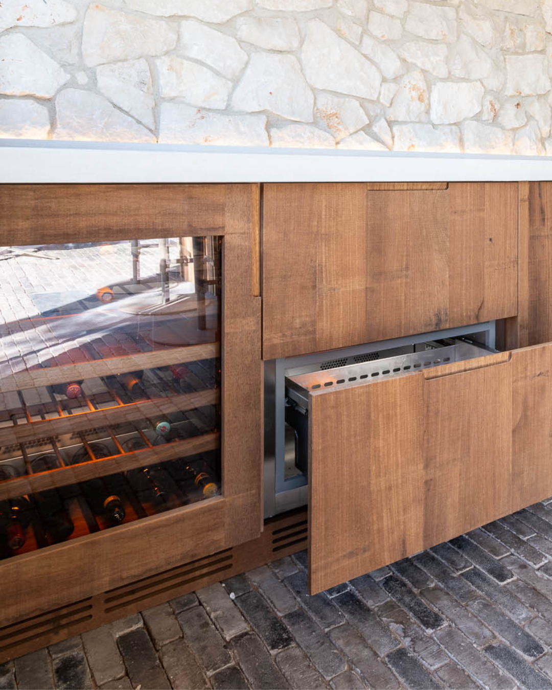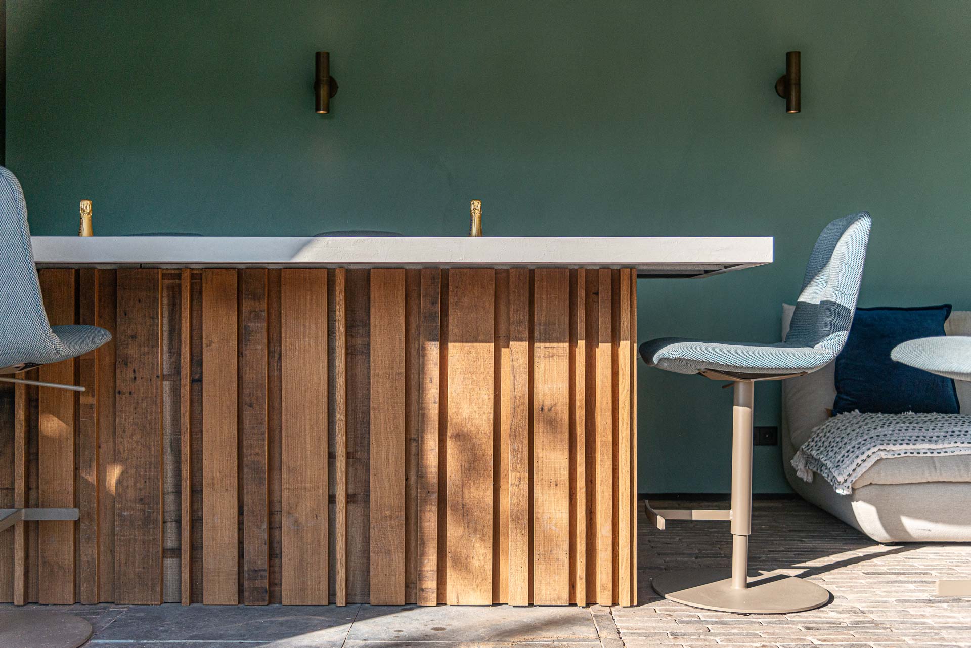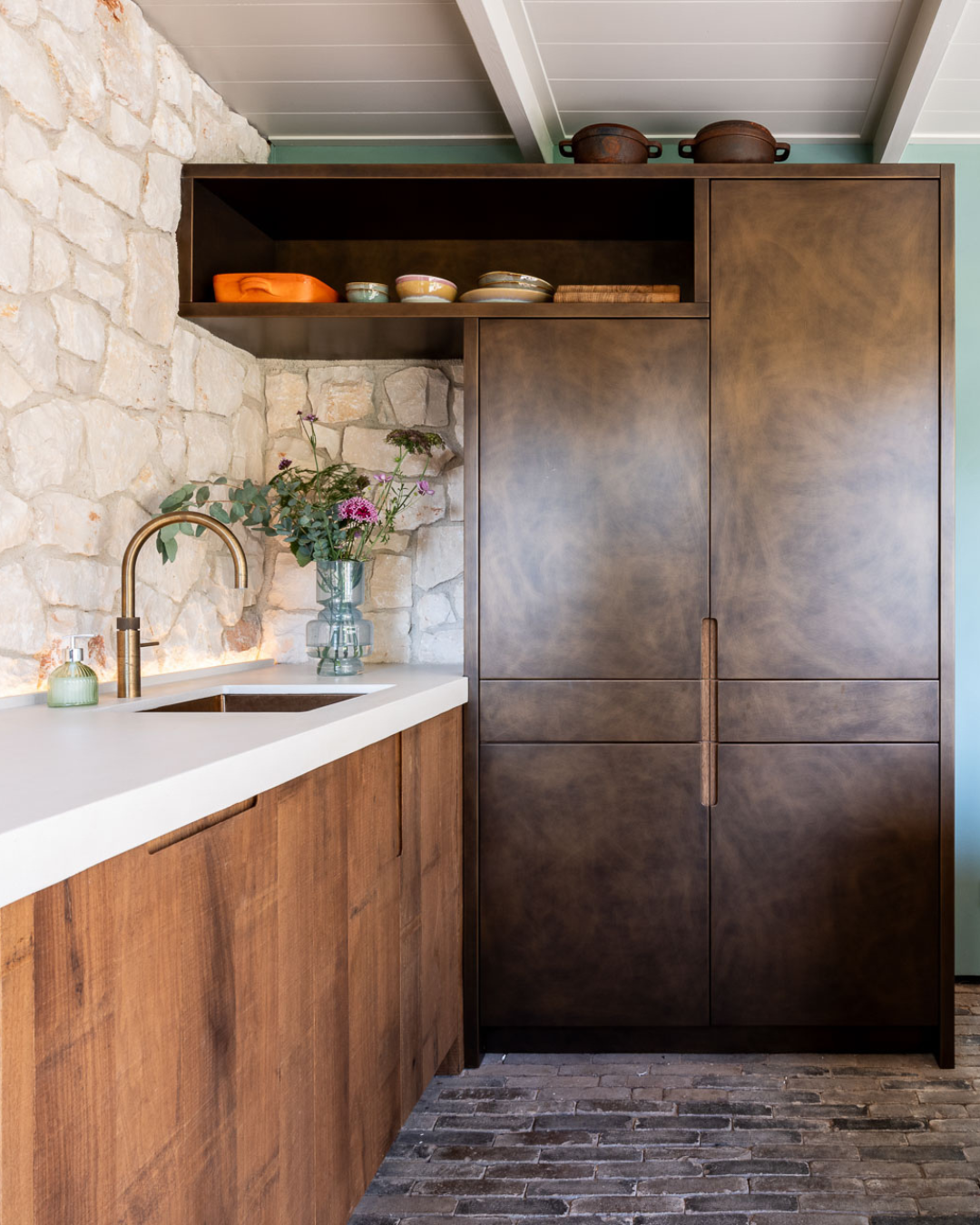 Dé eyecatcher is de maatwerk keuken met bar. De werkbladen van beton ciré combineren prachtig met het grove Fraké-hout van de keuken en de flagstones erboven. “Het plafondrek maakte Boudewijn van messing, wat ook terugkomt in de spots en de Quooker Cube, die kokend, bruisend en gekoeld water geeft. En heb je die speelse wijnplank gezien?” Koelkasten, Kaelo-wijnkoelers en interieurstyling maken het helemaal af.