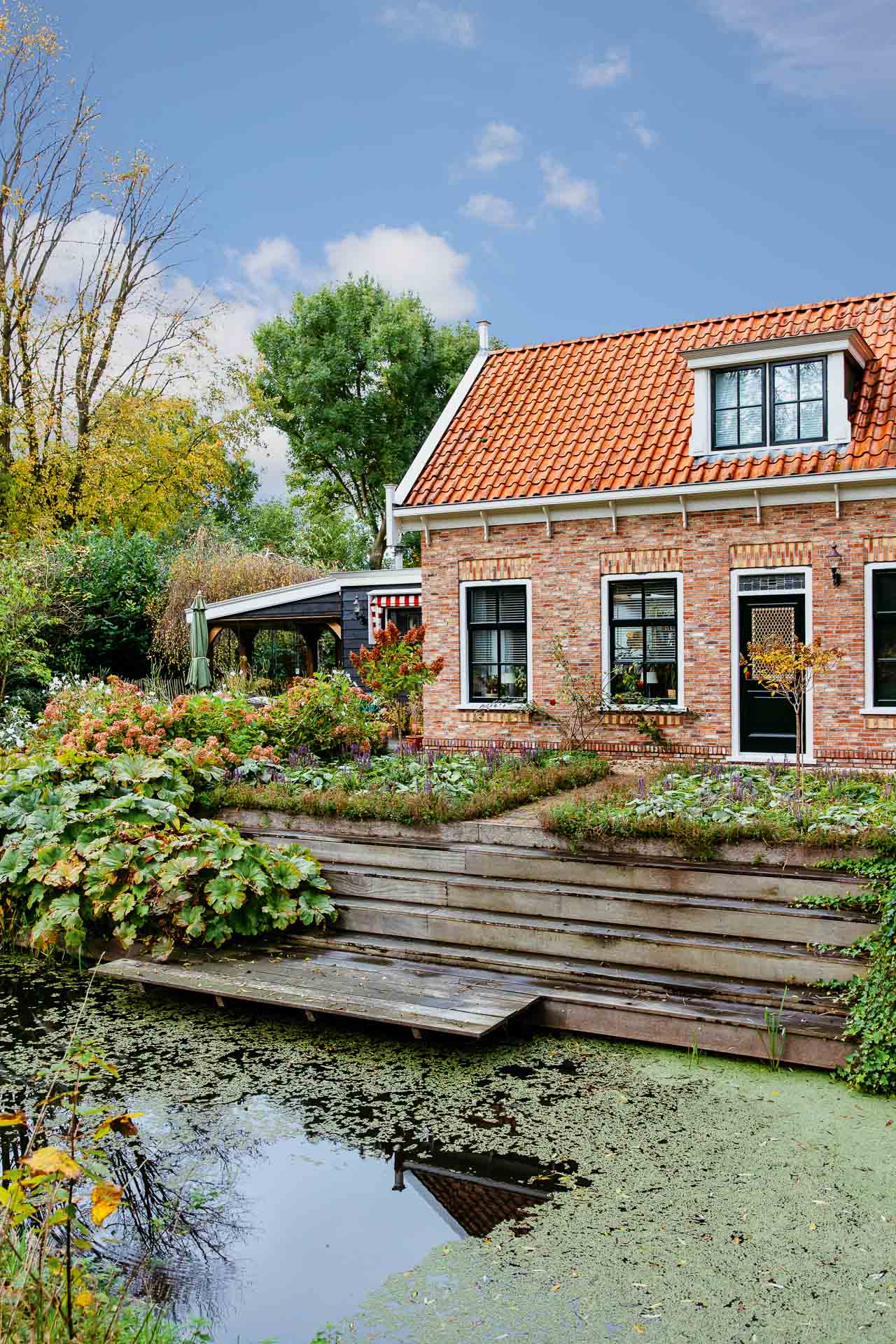 Vijf jaar geleden kochten ze deze plek. Toen nog een timmerschuur met een oud woonhuis ertegenaan. Inmiddels is het een duurzaam familiehuis, energieneutraal en omgeven door een tuin die elk seizoen iets nieuws prijsgeeft. Hans – van oorsprong hovenier – wist meteen wat hij wilde. “De tuin was toen een aannemerserf met bouwmaterialen en boten. Daar werden we niet vrolijk van. Maar we zagen het potentieel. We wilden een natuurlijke tuin, rijk aan soorten en vol leven.”